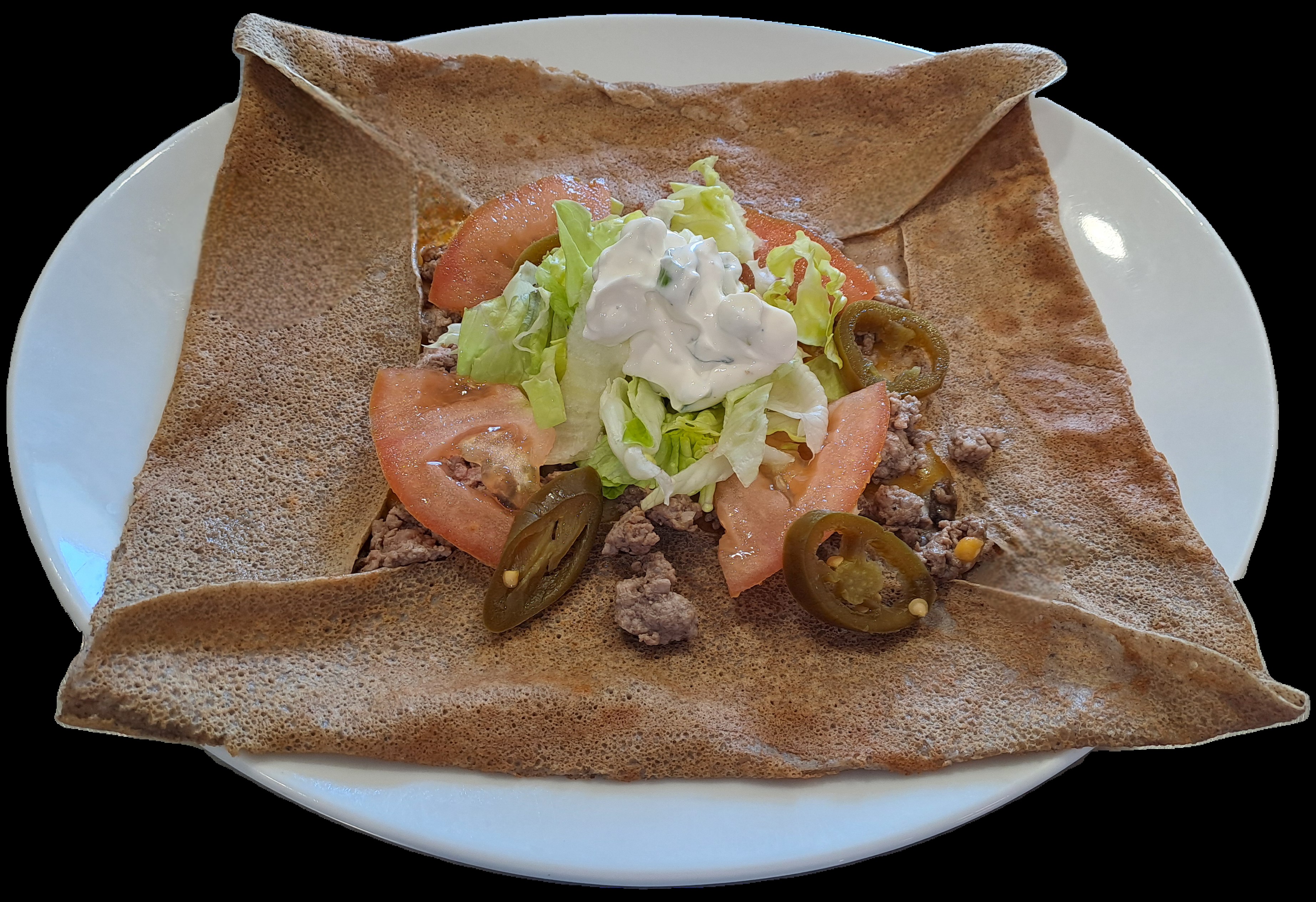 Mozzarella/Cheddar, Ground Beef, Jalapeños, Lettuce, Tomato, Fresh Herbs Sour Cream