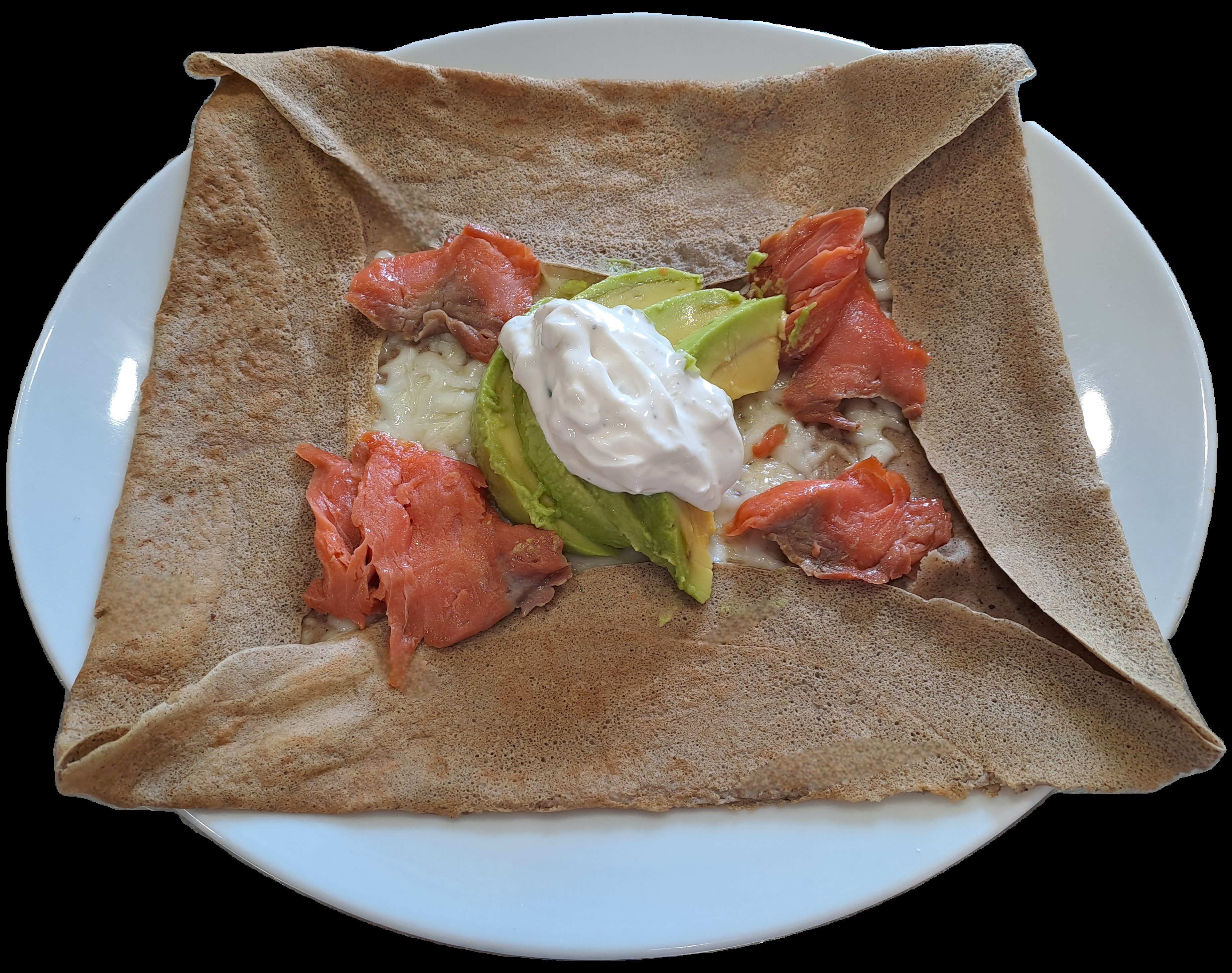 Mozzarella/Swisscheese, Smoked salmon, Avocado, Fresh herbs Sour Cream