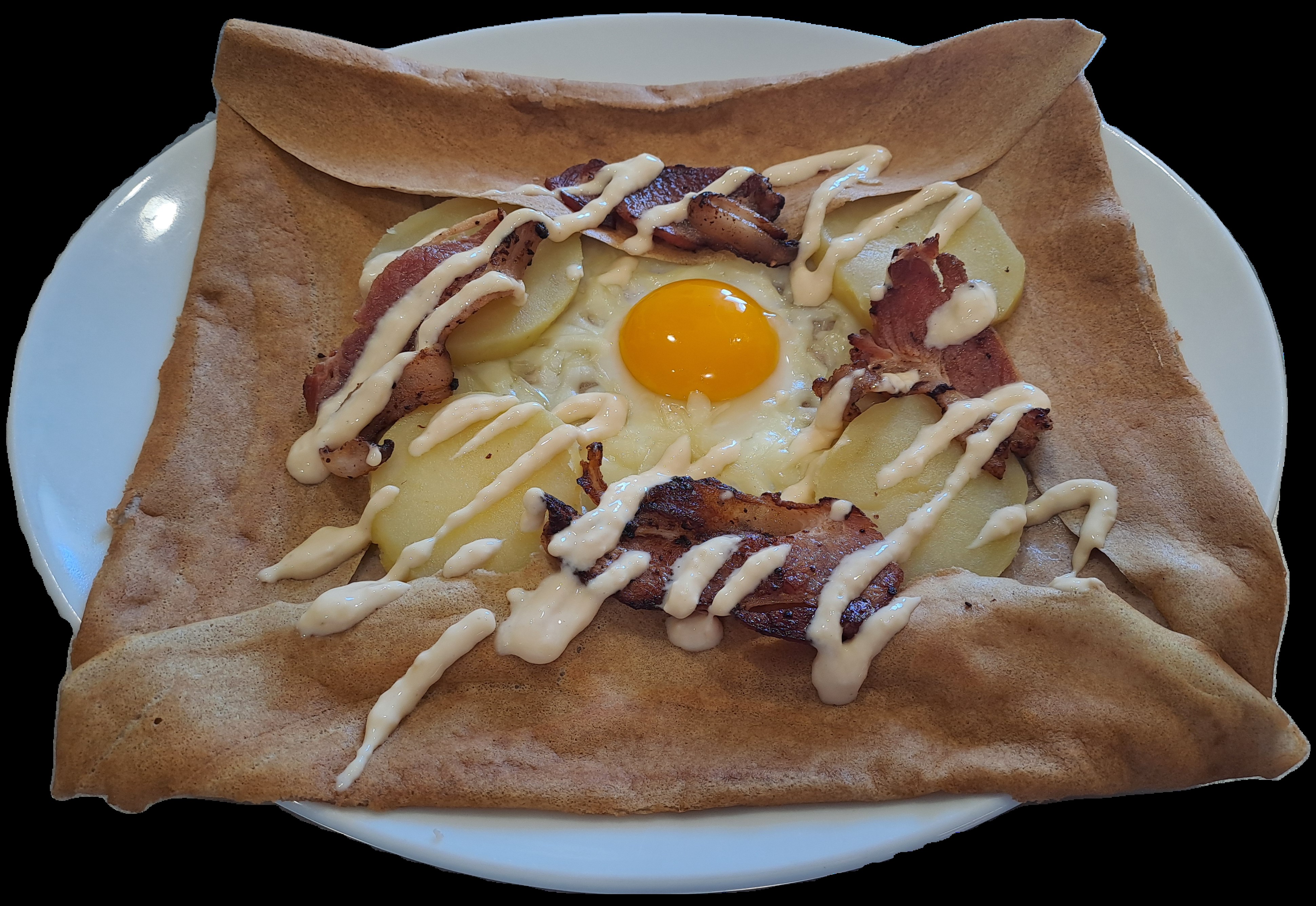 Mozzarella/Swisscheese, Egg, Bacon, Potatoes, White sauce
