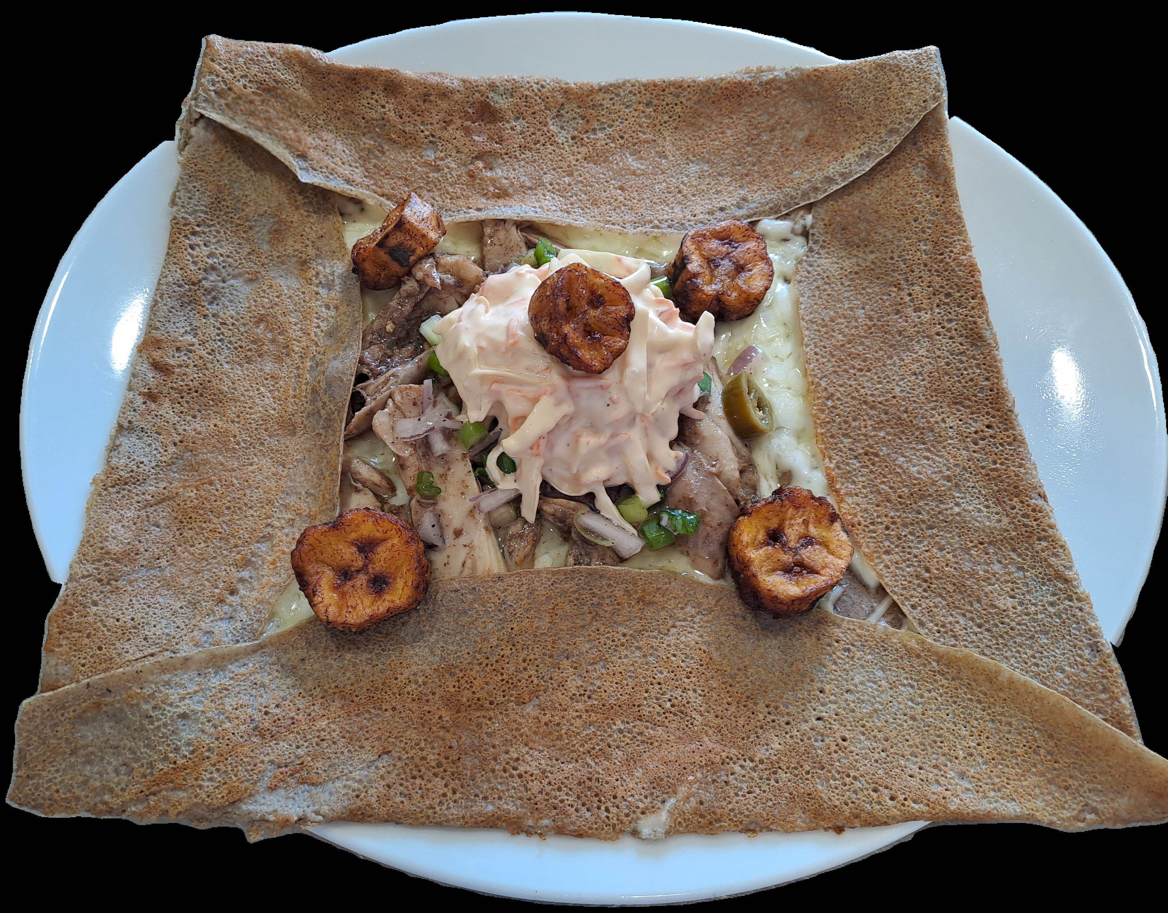 Mozzarella/Emmental, Pimento Jerk Chicken, Plantain Banana, Coleslaw, Creole Sauce