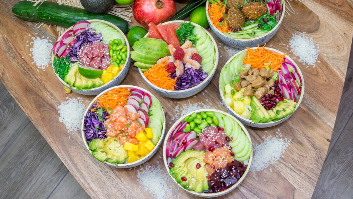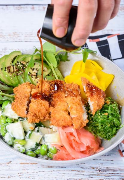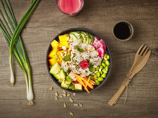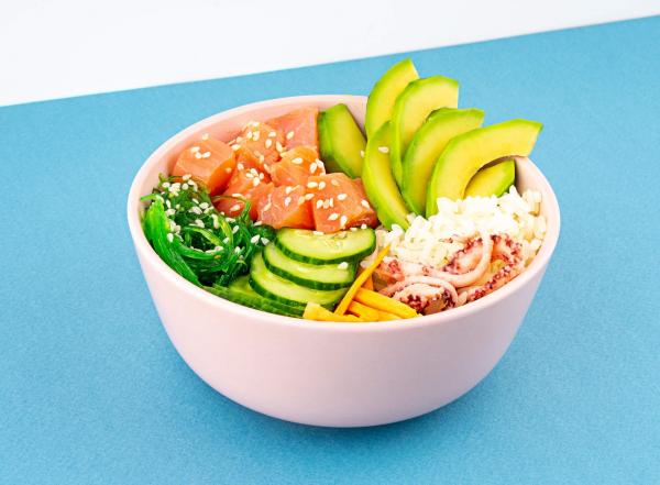 Salmon marinated in soy, Japanese cabbage salad, Avocado, Red onion, Kumato tomatoes, Cucumbers, Kaz à Poke sauce, Sesa…