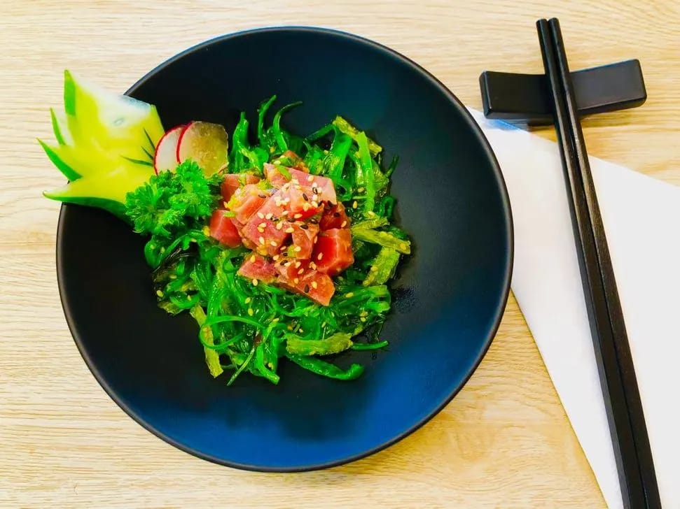 Tuna marinated in teriyaki, Marinated red cabbage, Wakame, Carrots, Avocado, Mango, Lemon cream cheese, Fried onions, S…