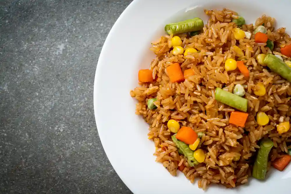 Fried rice, corn, carrots, edamame, onions, Morteau sausages